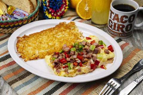 Servido con 3 huevos, papa de la casa o papa rallada, tortillas o pan