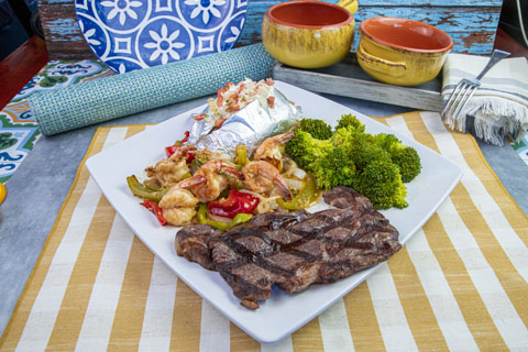 Rib eye (240gr), camarones (110gr), brocoli, papa al horno